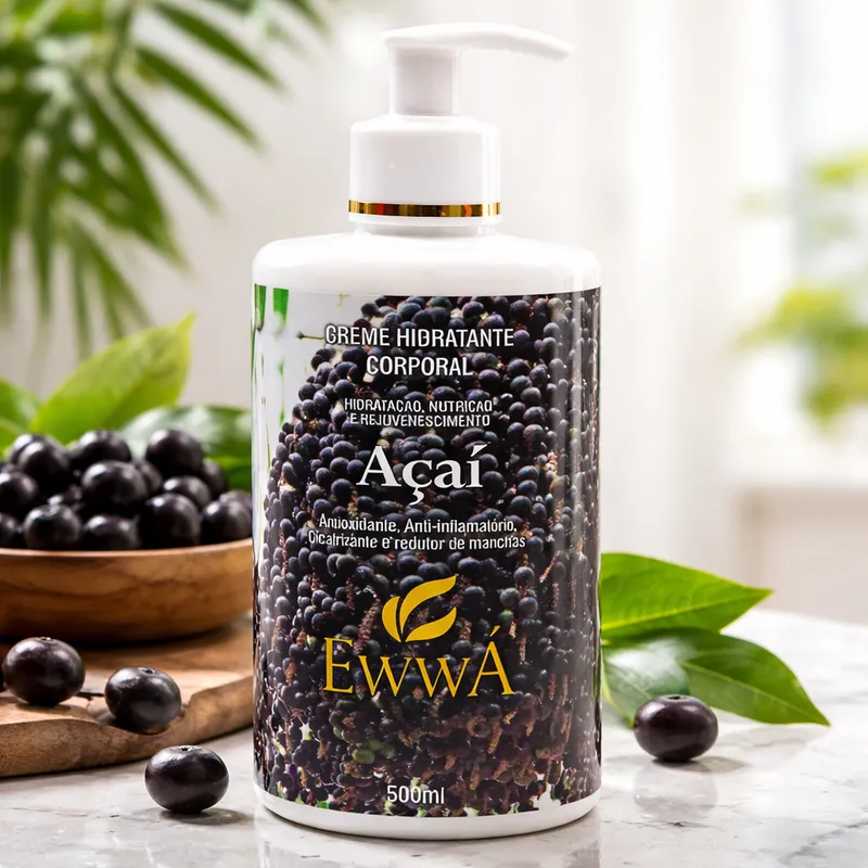Descubra o poder da natureza na sua rotina de cuidados! O Hidratante Corporal Açaí Ewwácombina os antioxidantes do açaí, que ajudam a prevenir rugas, manchas e flacidez, com a nutrição intensa do óleo de castanha-do-pará e a hidratação profunda da manteiga de karité. Sua fórmula exclusiva revitaliza a pele, melhora a elasticidade e deixa um toque incrivelmente macio. Ideal para quem busca uma pele visivelmente mais jovem, bonita e cheia de vida.